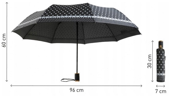 Średnica parasola 105 cm, po czaszy 118 cm, długość po złożeniu 33cm