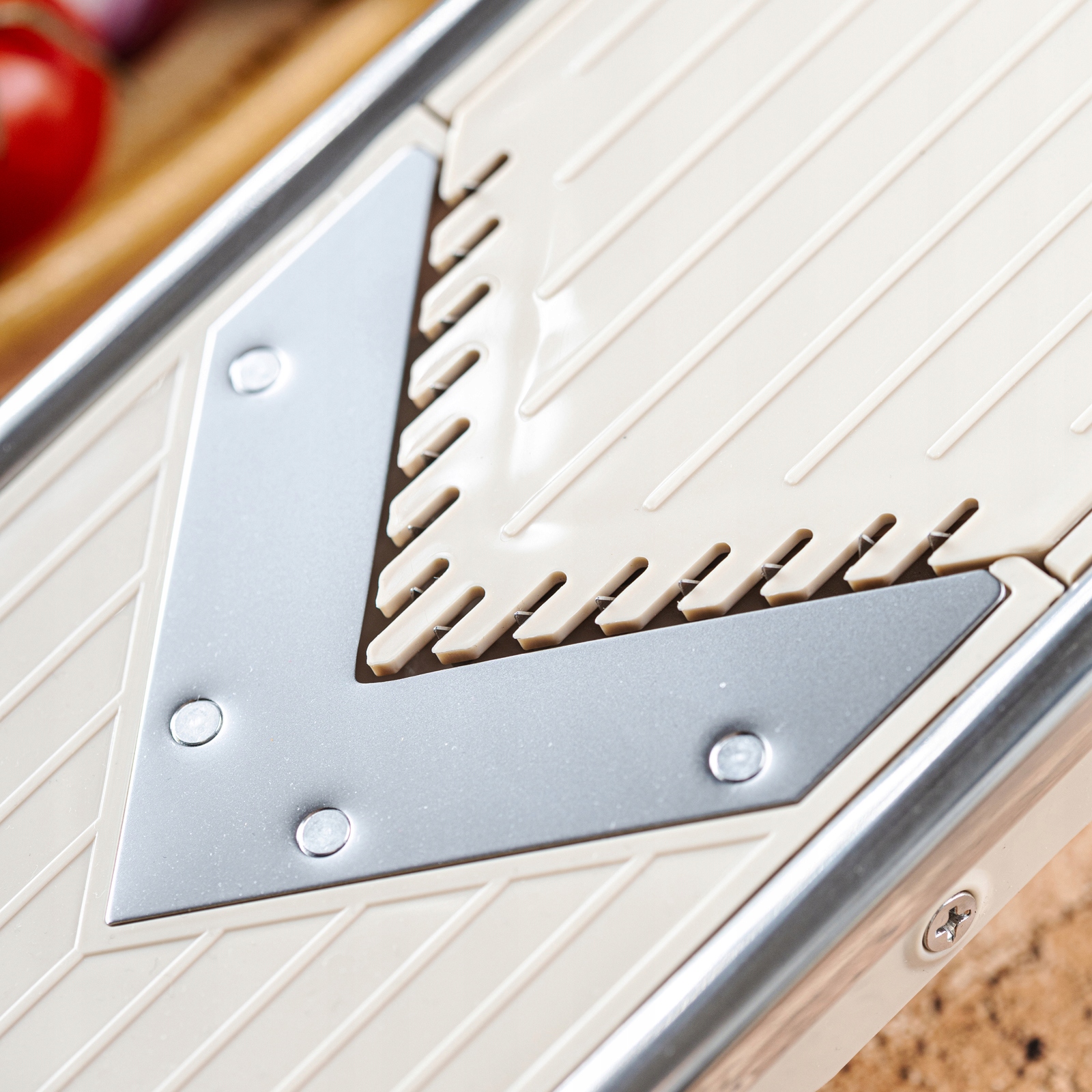- Ostre ostrza w kształcie V – czyste cięcie, warzywa zachowują strukturę i soki.