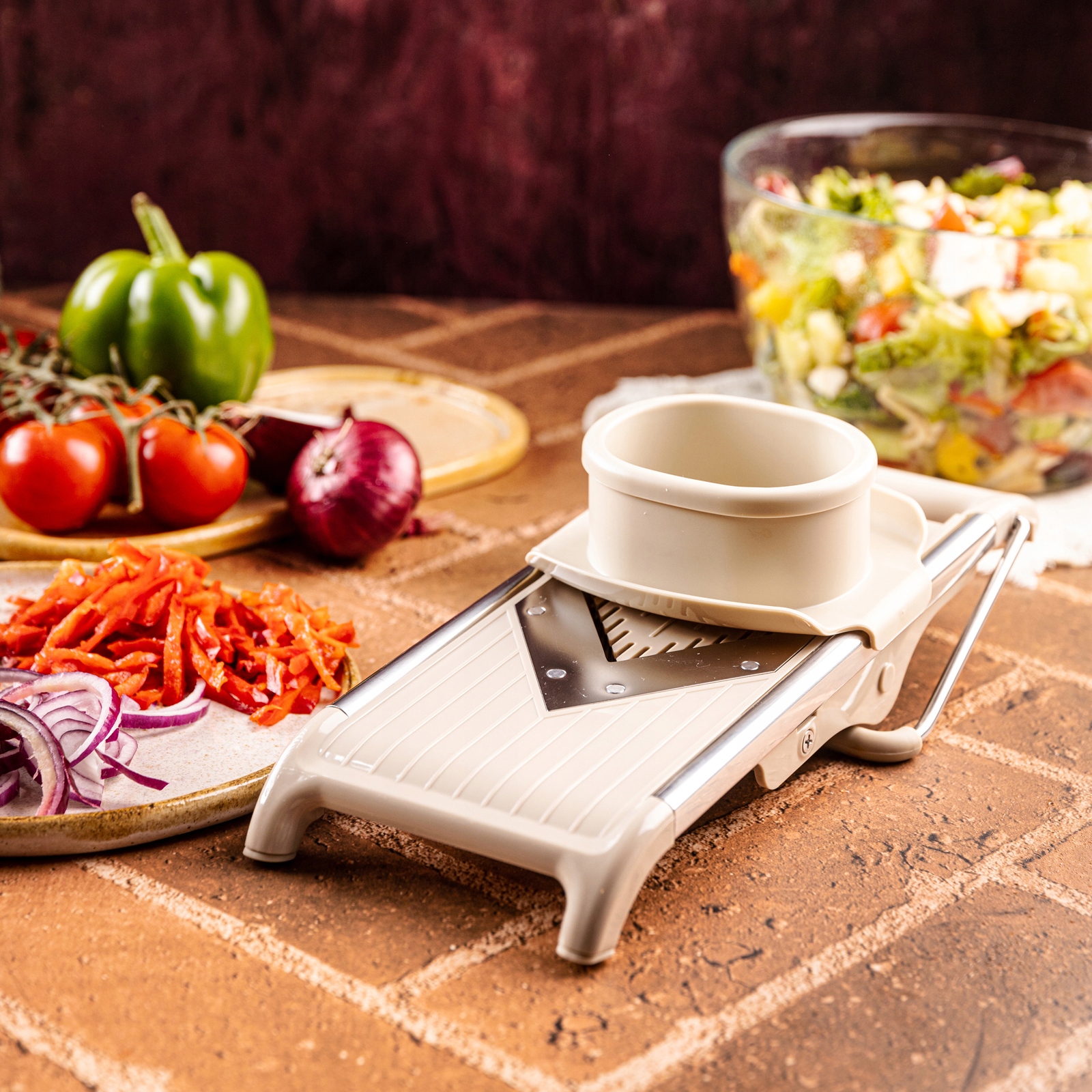 Kapusta, ogórek, ziemniak, cebula, marchew, cukinia, jabłko – plastry, talarki i słupki do sałatek, frytek warzywnych, stir-fry, zapiekanek czy dekoracji.