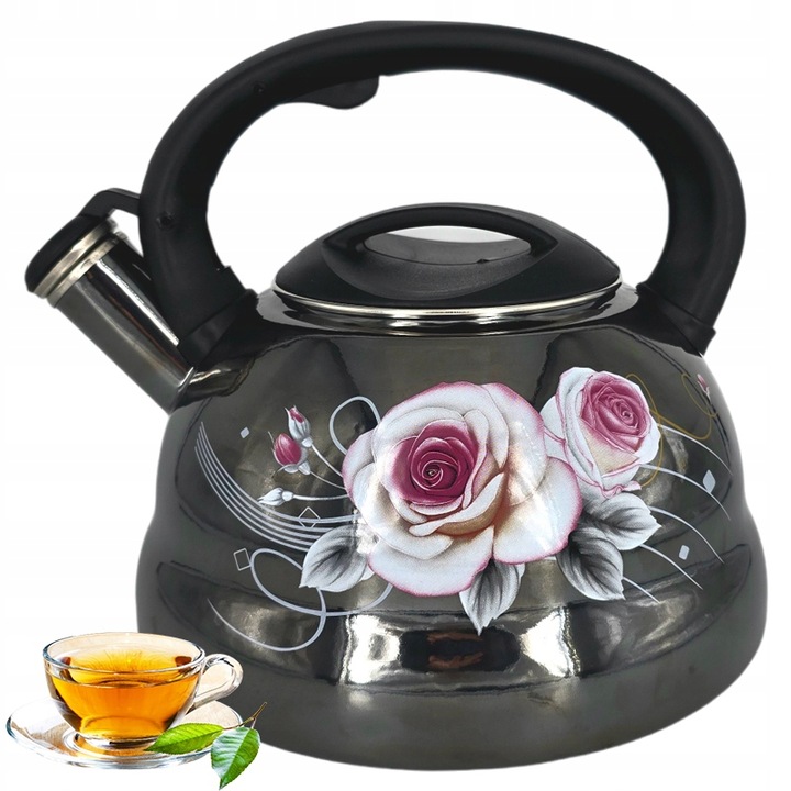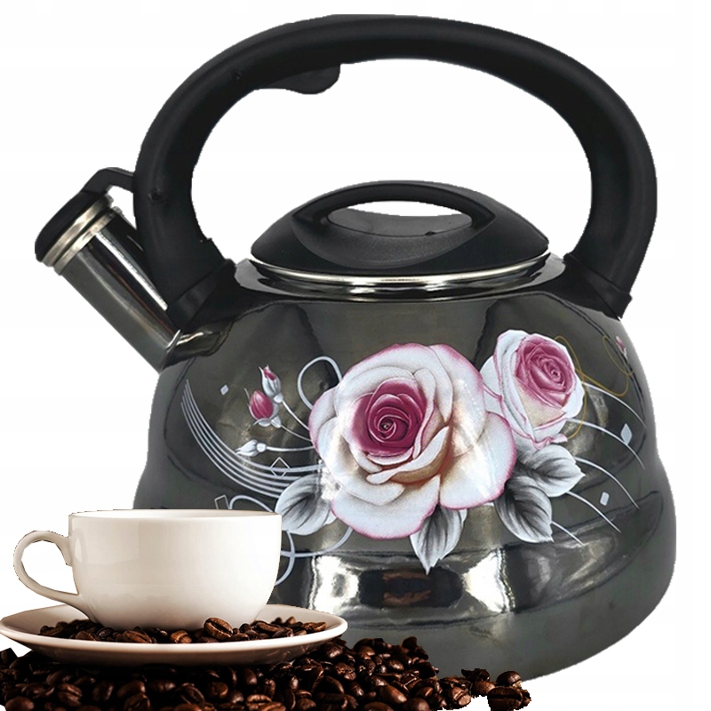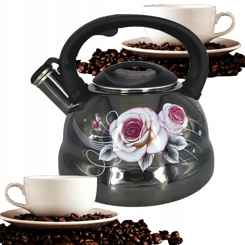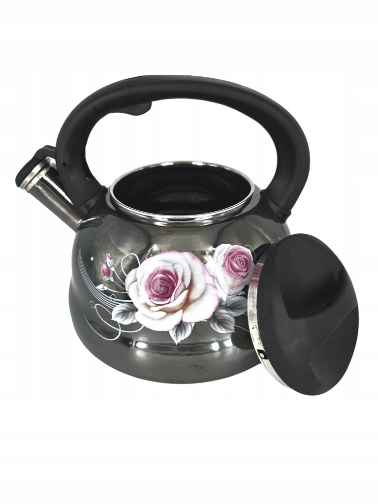 - Czarny czajnik emaliowany z gwizdkiem ozdobiony delikatnym wzorem biało-różowych kwiatów to połączenie funkcjonalności i elegancji.
