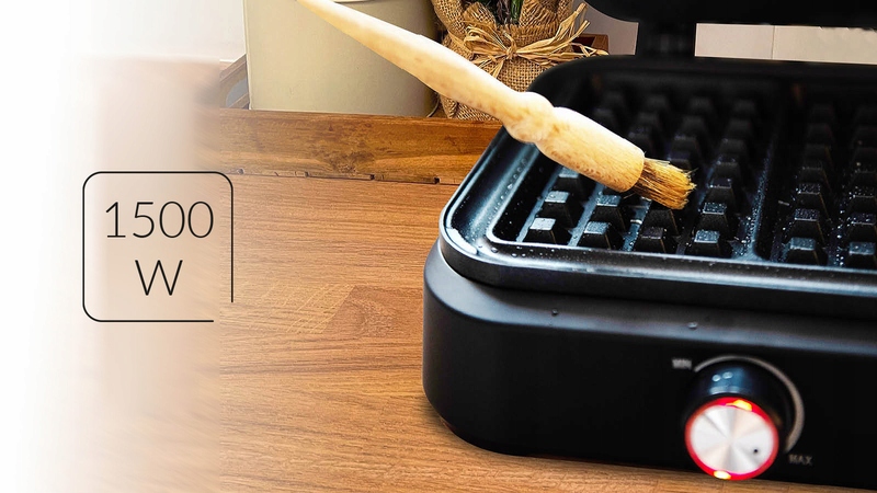 Wysoka moc 1500 W powoduje szybkie nagrzewanie płyt i błyskawiczną gotowość urządzenia do pracy oraz równomierne opiekanie gofrów, które zachwycają lekkością i chrupkością.