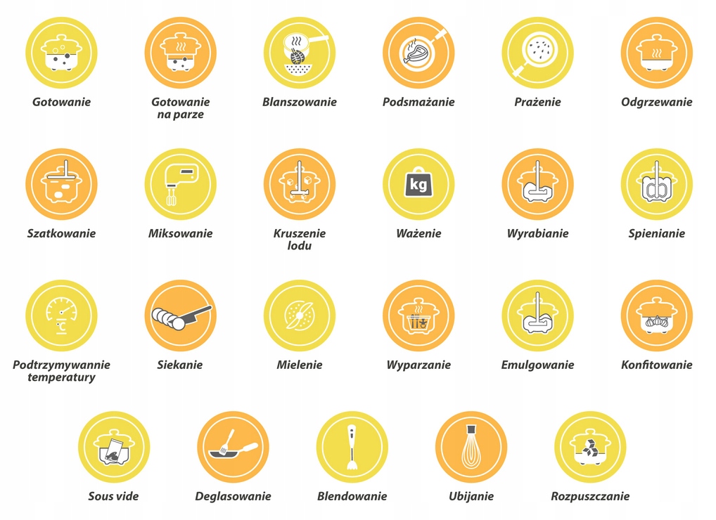 | Funkcje | gotowanie, krojenie na plasterki, mielenie, mieszanie, miksowanie, podgrzewanie, rozdrabnianie, szatkowanie, ubijanie, wyrabianie ciasta, programy automatyczne |